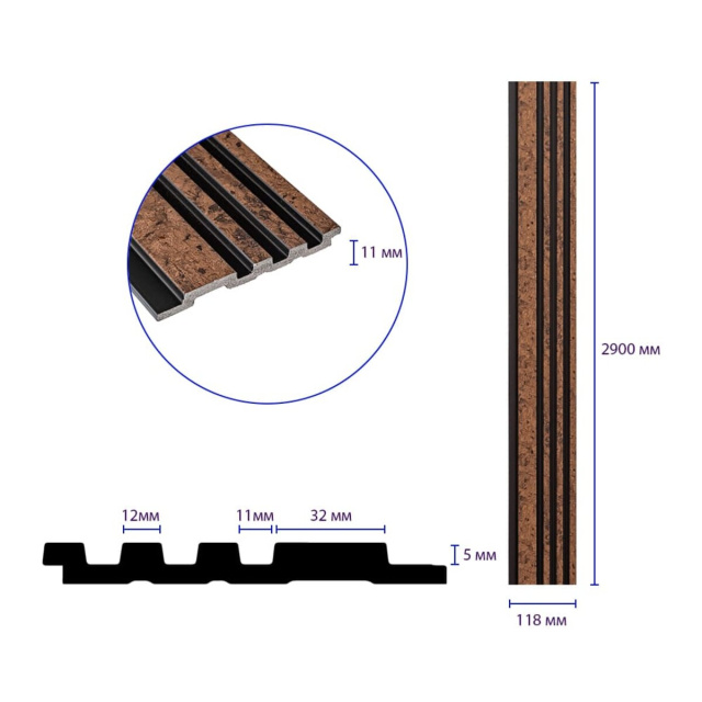 - Площадь покрытия: 118х2900х11 мм – 0,34 м², количество на 1 м² – 3 единицы
