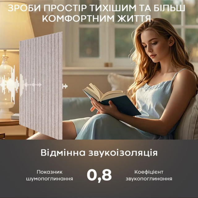 • Эффективное поглощение шума: плотная волокнистая структура панели поглощает звуковые волны и снижает эхо, создавая более тихую и комфортную атмосферу для работы, отдыха или развлечений.