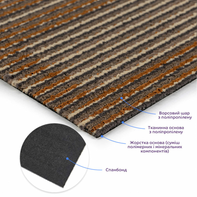• Спанбонд — это нетканый материал, изготовленный из полипропиленовых (PP) волокон, которые формируются в виде тонкой «паутины» расплавленного полимера. Волокна равномерно распределяются и термически спаиваются между собой, образуя плотное однородное полотно. Материал абсолютно не тянется, имеет стабильную форму, высокую прочность на разрыв и истирание, не впитывает влагу и не поддерживает горение. Благодаря этим свойствам спанбонд используется как стабилизирующий слой в ковролиновой плитке — он сохраняет форму покрытия, предотвращает деформацию и делает материал долговечным.