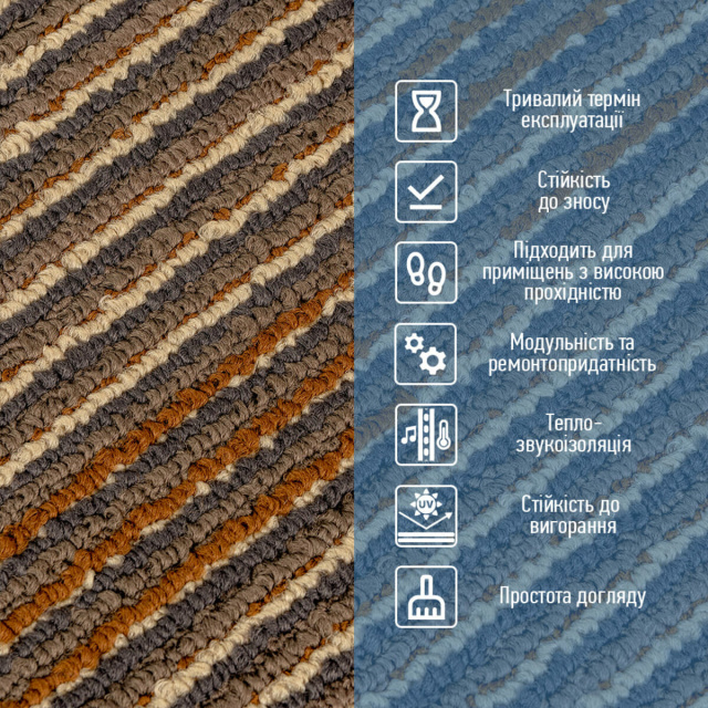 • Износостойкость и длительный срок эксплуатации Ковролин имеет плотный, густой ворс, который плотно прилегает и практически не поддаётся истиранию. Благодаря этому покрытие выдерживает интенсивную эксплуатацию даже в помещениях с высокой проходимостью, таких как коридоры, офисы, магазины или коммерческие зоны. Материал сохраняет цвет, структуру и форму под постоянной нагрузкой, обеспечивая долговечность покрытия и экономию на ремонте.