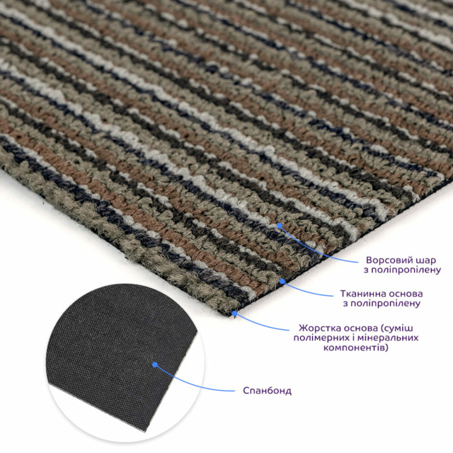 • Спанбонд — это нетканый материал, изготовленный из полипропиленовых (PP) волокон, которые формируются в виде тонкой «паутины» расплавленного полимера. Волокна равномерно распределяются и термически спаиваются между собой, образуя плотное однородное полотно. Материал абсолютно не тянется, имеет стабильную форму, высокую прочность на разрыв и истирание, не впитывает влагу и не поддерживает горение. Благодаря этим свойствам спанбонд используется как стабилизирующий слой в ковролиновой плитке — он сохраняет форму покрытия, предотвращает деформацию и делает материал долговечным.