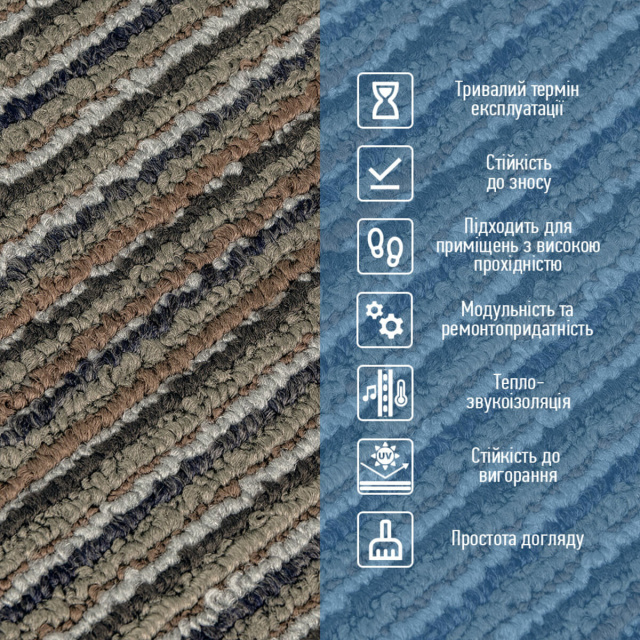 Ковролин в плитках — это современное модульное покрытие в виде квадратов 50×50 см, толщиной 3–4 мм, которые монтируются за счёт собственного веса или фиксируются с помощью клея. Отличается высокой плотностью ворса, благодаря чему материал износостойкий, влагостойкий и подходит для покрытия как малых, так и больших площадей, в том числе помещений с высокой проходимостью — офисов, коридоров, залов или жилых комнат.