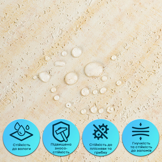 • Устойчивость к влаге и пару Гибкая штукатурка не впитывает воду, не набухает и не деформируется под воздействием влаги. Материал устойчив к парам, не способствует образованию плесени и подходит для помещений с повышенной влажностью — кухонь, ванных комнат. Может применяться в зоне кухонного фартука (при отступлении от плиты на 25-30 см).