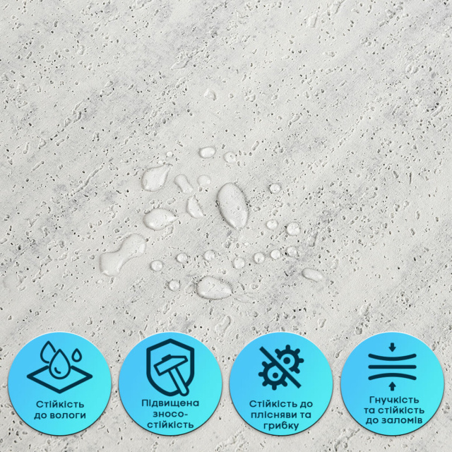 • Устойчивость к влаге и пару Гибкая штукатурка не впитывает воду, не набухает и не деформируется под воздействием влаги. Материал устойчив к парам, не способствует образованию плесени и подходит для помещений с повышенной влажностью — кухонь, ванных комнат. Может применяться в зоне кухонного фартука (при отступлении от плиты на 25-30 см).