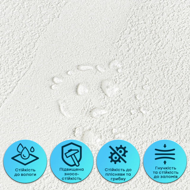 Гибкая штукатурка не впитывает воду, не набухает и не деформируется под воздействием влаги. Материал устойчив к парам, не способствует образованию плесени и подходит для помещений с повышенной влажностью — кухонь, ванных комнат. Может применяться в зоне кухонного фартука (при отступлении от плиты на 25-30 см).