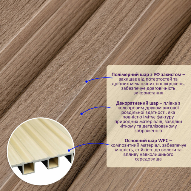 • Полимерный слой, защищает от потертостей и мелких механических повреждений, обеспечивает долговечность использования, а УФ защита помогает предотвратить выгорание, сохраняя цвет декоративного слоя насыщенным, за счет чего рейка долго имеет свой первоначальный эстетический вид.