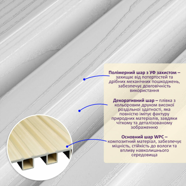 • Полимерный слой, защищает от потертостей и мелких механических повреждений, обеспечивает долговечность использования, а УФ защита помогает предотвратить выгорание, сохраняя цвет декоративного слоя насыщенным, за счет чего рейка долго имеет свой первоначальный эстетический вид.