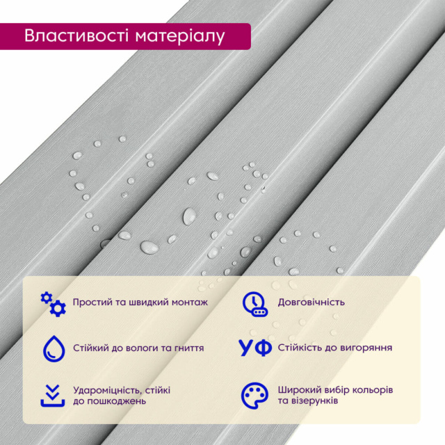 • Полимерный слой, защищает от потертостей и мелких механических повреждений, обеспечивает долговечность использования, а УФ защита помогает предотвратить выгорание, сохраняя цвет декоративного слоя насыщенным, за счет чего рейка долго имеет свой первоначальный эстетический вид.